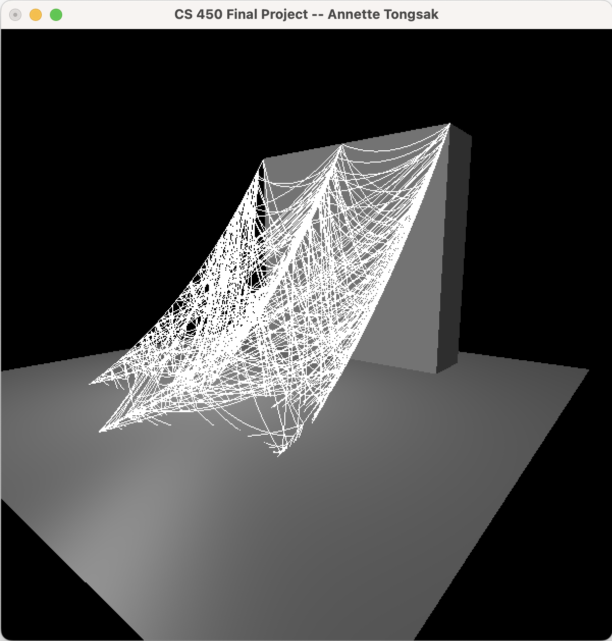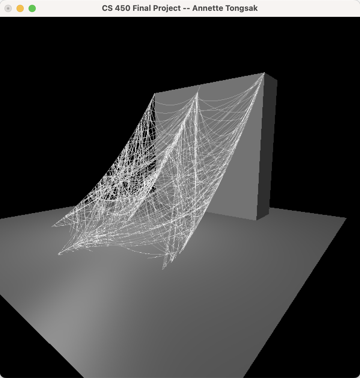 My final project was inspired by a video of Pixar's cobweb generation program for Toy Story 4 and DreamWorks' 2011 paper, “Building and Animating Cobwebs for Antique Sets.” This project taught me a lot about the math behind implementing parabolas in 3D space. You can learn more about it here.