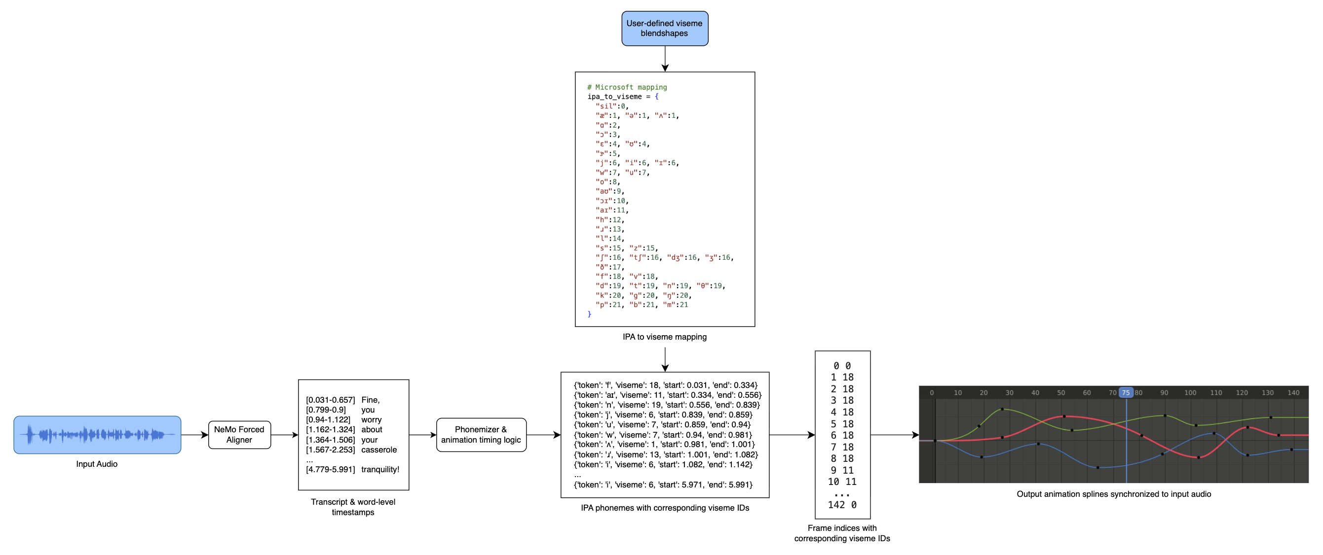 At a high level, the system converts audio into timestamped phonemes and maps those phonemes to viseme blendshapes, which are then used to generate mouth animation keyframes in Blender.